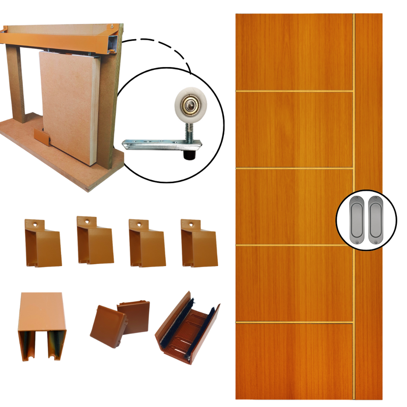Kit porta madeira com trilho de alumínio, é perfeito para você que deseja instalar uma porta de correr com falicidade e qualidade, seja na sua sala, cozinha, banheiro ou outro ambiente interno que necessite a colocação de uma porta.