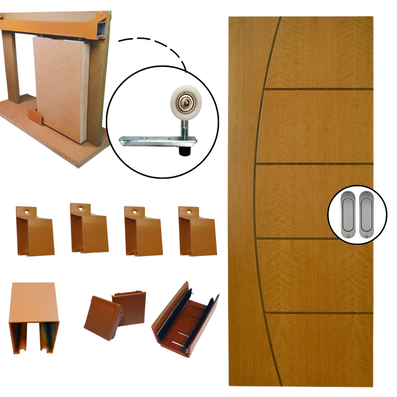 Kit porta madeira com trilho de alumínio, é perfeito para você que deseja instalar uma porta de correr com falicidade e qualidade, seja na sua sala, cozinha, banheiro ou outro ambiente interno que necessite a colocação de uma porta.